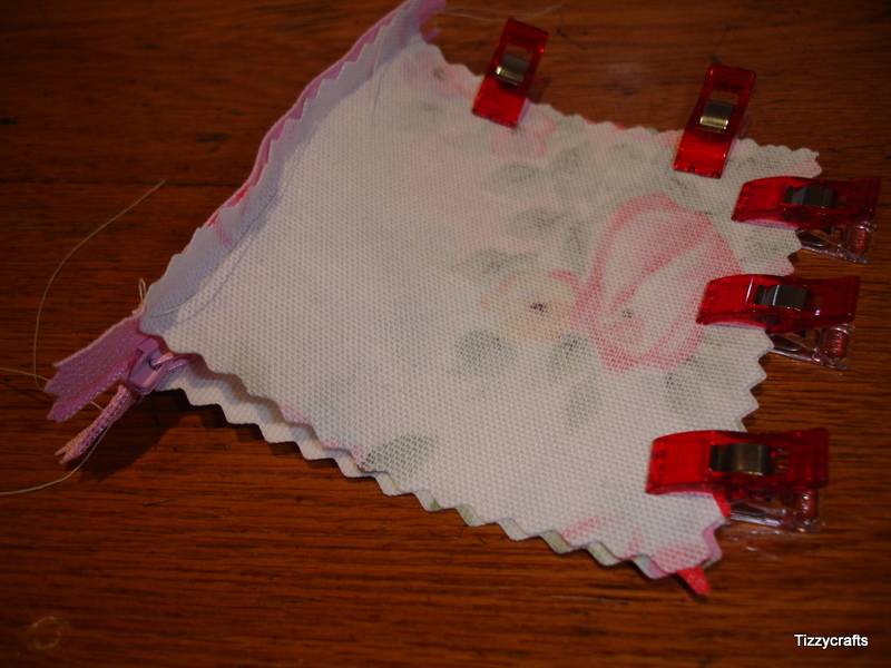 Bring the zip seam across to the clip holding the ribbon tag and clip it in, this will give you the shape of your case.
